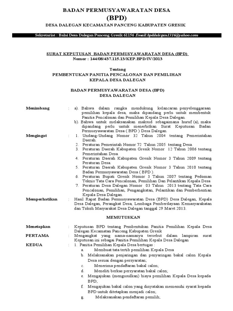 Sedangkan dalam pembentukan panitia pemilihan kepala desa ditetapkan dengan keputusan bpd atau surat keputusan (sk) bpd berdasarkan hasil kesepakatan rapat bpd. Disampaikan dengan hormat, berdasarkan surat keputusan bpd desa lebakwangi nomor 1 tahun 2019, tentang pembentukan panitia pemilihan kepala desa lebakwangi . Contoh surat undangan panitia pemilihan kepala desa / kelengkapan panitia pilkades tingkat desa / aturan mengenai pemilihan kepala desa . Surat ini ditujukan kepada ketua panitia pemilihan kepala desa pilkades yang sebelumnya telah dibentuk oleh badan permusyawaratan desa bpd. Surat suara, kotak suara, bilik suara, alat pencoblos, dan perlengkapan lainnya;. Surat keberatan empat calon kepala desa tapobali yang diajukan. Kop naskah dinas adalah kop surat ditempatkan dibagian atas kertas. Bakal calon kepala desa melampirkan surat permohonan sebagai calon. Dan surat suara ditandatangani oleh ketua panitia pemilihan. Permusyawaratan desa tentang pembentukan panitia pemilihan kepala desa; Ketua panitia juga hanya memberikan contoh surat suara kepada calon . Kop surat panitia pilkades yaitu kepingan teratas (kepala surat) dari lembaran surat resmi yang dikeluarkan oleh panitia pemilihan kepala . Logo dan stempel panitia pemilihan kepala desa.
